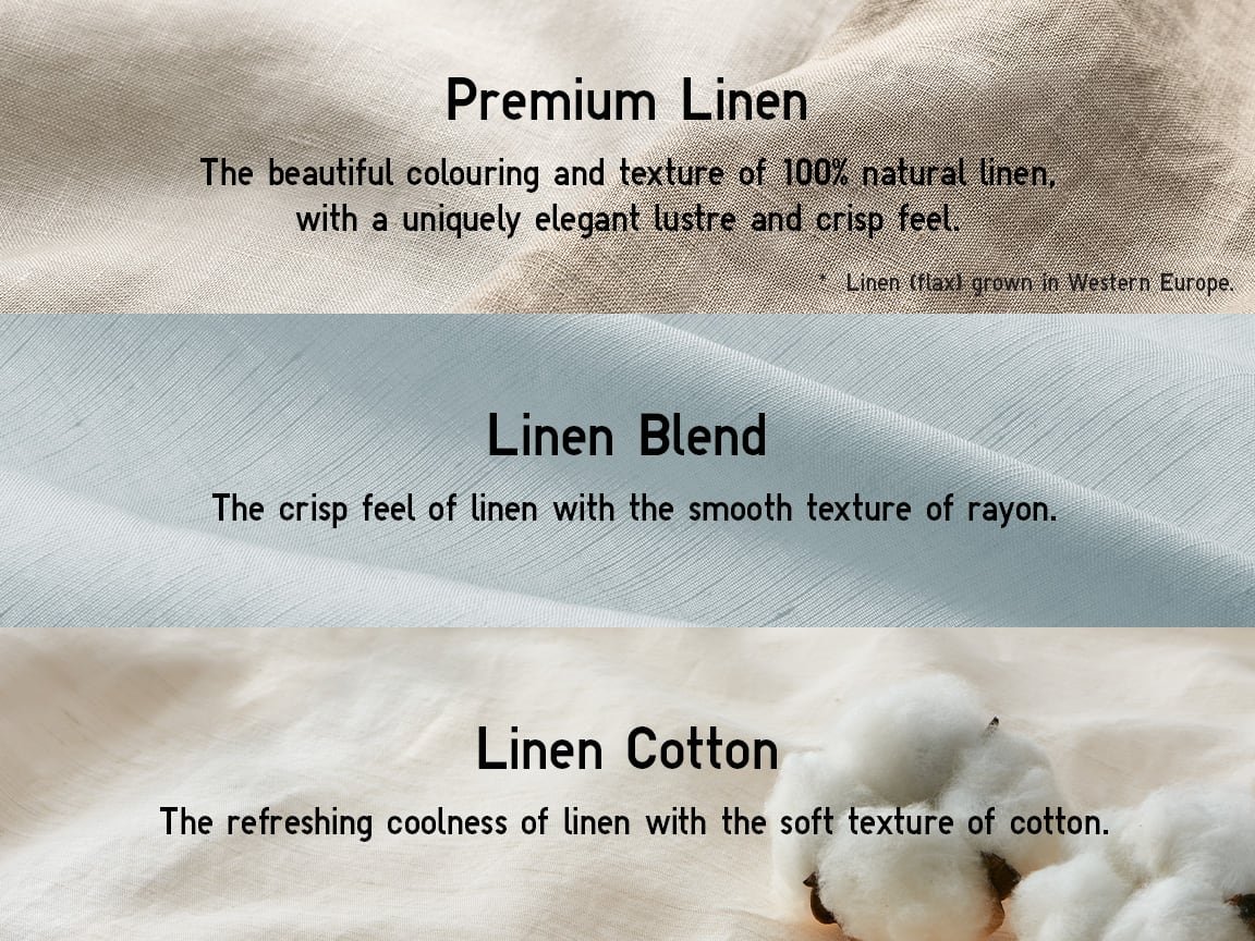 Linen Cotton combines the light feel of linen with the softness of cotton, providing all-day comfort and freshness.